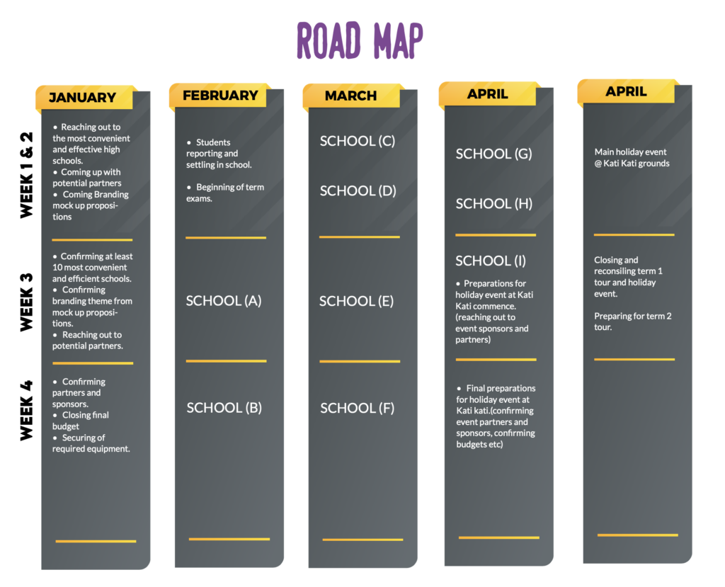 These may include beverage companies, confectionery businesses, educational material providers financial institutions, NGOs, and more. Our goal is to gather resources and manage budgets effectively, specifically allocating funds to various areas such as transportation for both individuals and equipment during tours, compensating performers, acquiring stage lights and sound equipment, providing meals and merchandise, covering expenses for facilitators and counselors, ensuring security measures, creating branding materials, and other related costs.